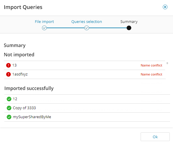 The import process begins. The queries that are successfully imported are listed. Those that cannot be imported are shown along with the reasons why.