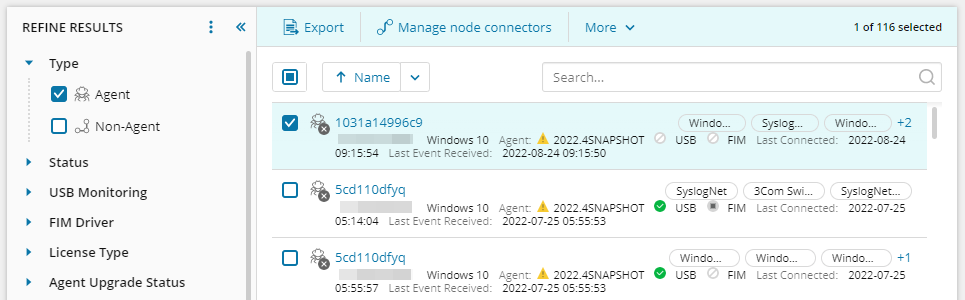Refine the node results by selecting an option in the Refine Results column. For example, to view all monitored agents, maximize Type and select the Non-Agent checkbox. All agents display in the center console with details about each monitored agent.