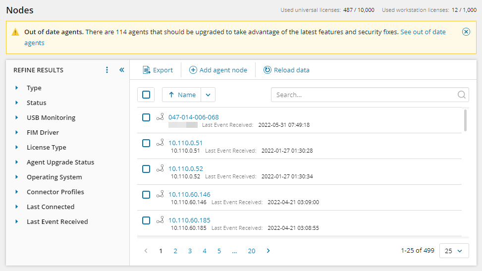 Click Configure > Nodes in the console toolbar to display your monitored nodes. If your SEM agents require an upgrade, a warning message displays on the page, as shown below.