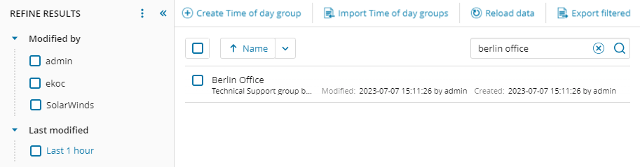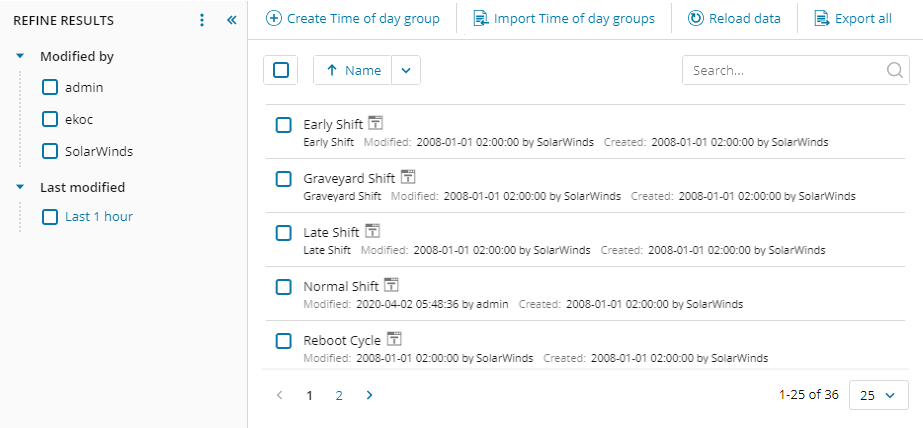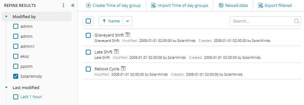 The Modify by options In the Refined Results column filters and displays only those groups last modified by a specific role or user. For example, when you click the SolarWinds checkbox, the console displays the group templates modified by SolarWinds and included with the application.