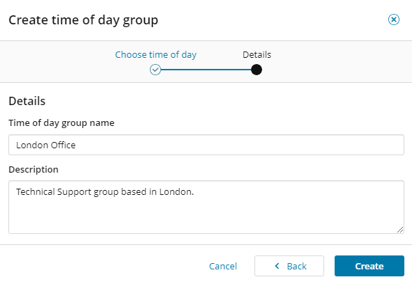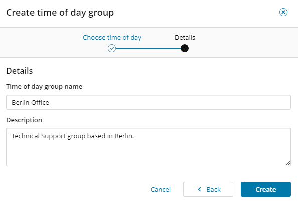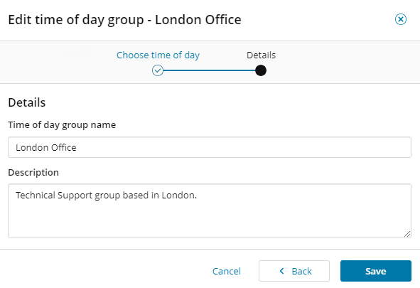 Time of day groups are groups of hours that you associate with rules and filters to execute different actions at different times of the day. You can create as many groups as required to reflect your business needs. A well-planned set of groups provide you with versatile and responsive rules that perform the way you want and when you want.