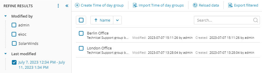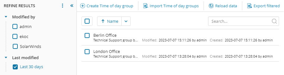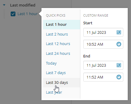For example, you want to view all groups that were modified in the last 30 days. To select this timeframe, click the last modified link (for example, Last 1 hour) and click Last 30 days in the Quick Picks menu.