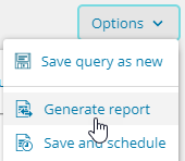 Mouse over the query name, click the vertical ellipsis  , and select Generate report. , and select Generate report.  You can also click the Options drop-down menu in the top toolbar and select Generate a report.