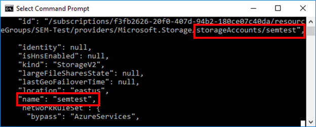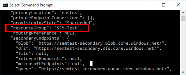 Find your resource group name in the Azure Portal, or run the az storage account list command, and then search for the resource group. In the following, the resource group is SEM-Test.