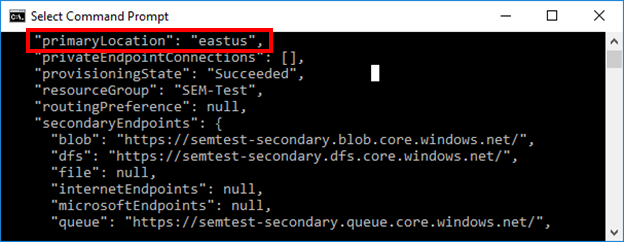 To find your location, look in your storage account details in the Azure Portal or run the az storage account list command, and then search for the location. In the following example, the location is eastus, for Eastern US.