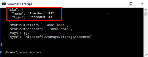 To find your sku, run the az storage account list command, and then search for the sku. In the example below, the sku name is Standard_LRS. The minimum requirement is Standard_LRS. Learn more about sku types here (© Microsoft 2020, available at learn.microsoft.com, retrieved October 5, 2020). If the returned SKU value is not supported (Standard_RAGRS, for example), change it to a supported value (see image below) when you update your script.