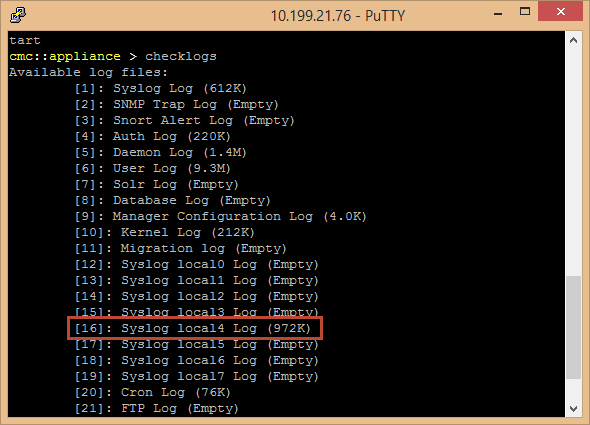 passwordas the password. - Open the appliance menu and run the checklogs command.