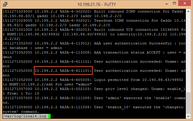 In the following example, local facility 4 is receiving traffic from the Cisco ASA firewall that was configured to send logs.
