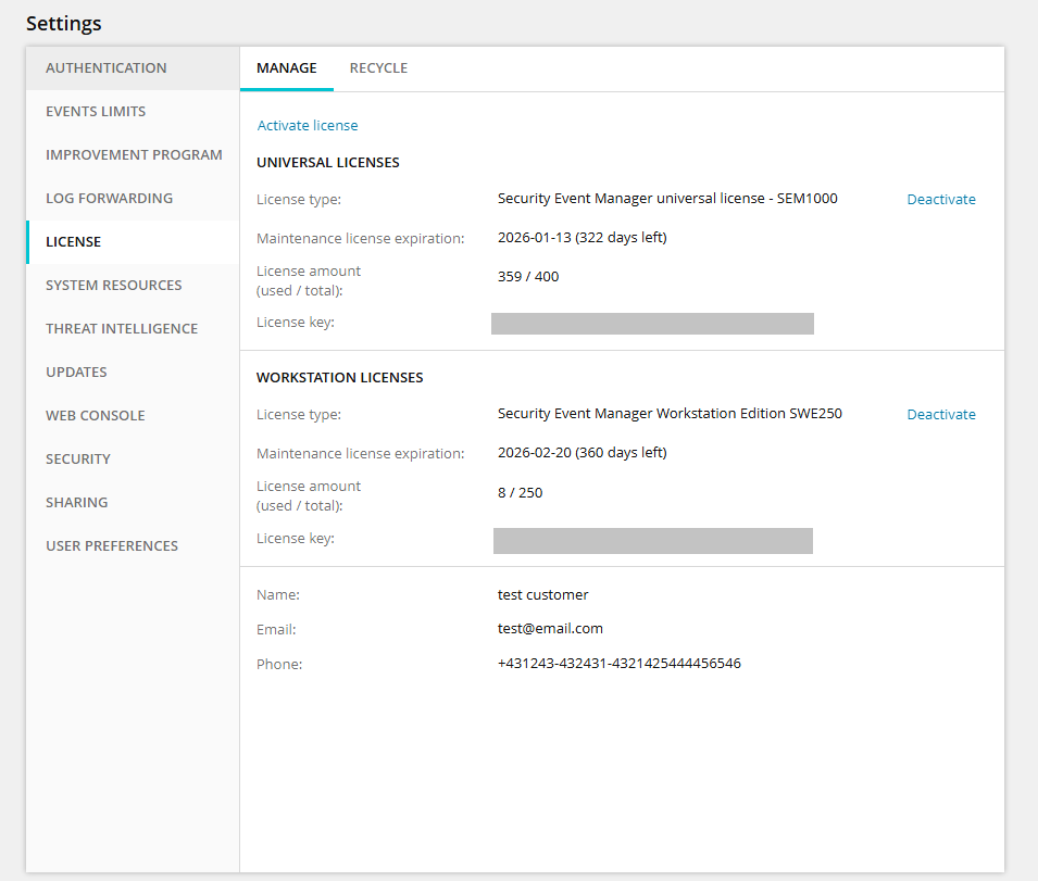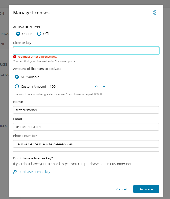 When you click Activate license, the Manage License form appears, displaying license information. If details are changed, the changes will be reflected across all licenses.