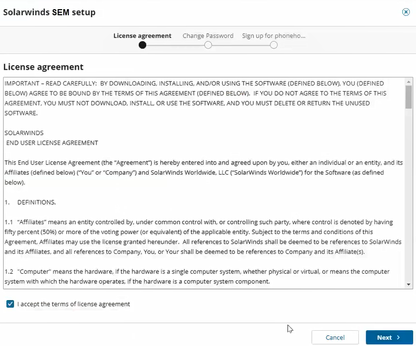 After you install and deploy SEM, run the setup wizard to accept the terms of the License Agreement and set up the default administrator credentials. When you are finished, you can add additional SEM users as needed.