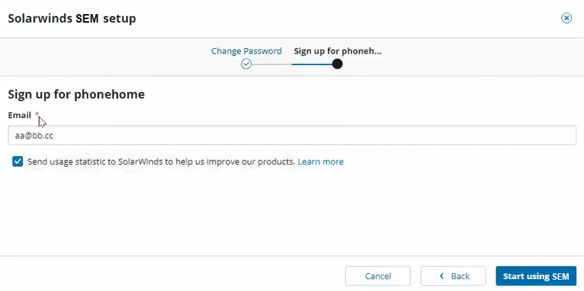 - Enter your email address for contact and download verification, and then select or clear the check box to send usage statistics to SolarWinds.