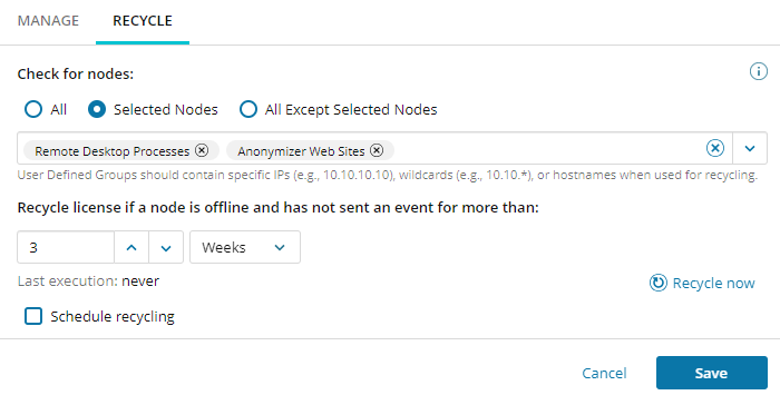 License recycling allows you to collect and reuse your subscription or SEM licenses from monitored nodes that are offline and failed to send an event to the SEM manager within a specified amount of time. You can apply license recycling to all network nodes, selected nodes, or all nodes except your selected nodes.
