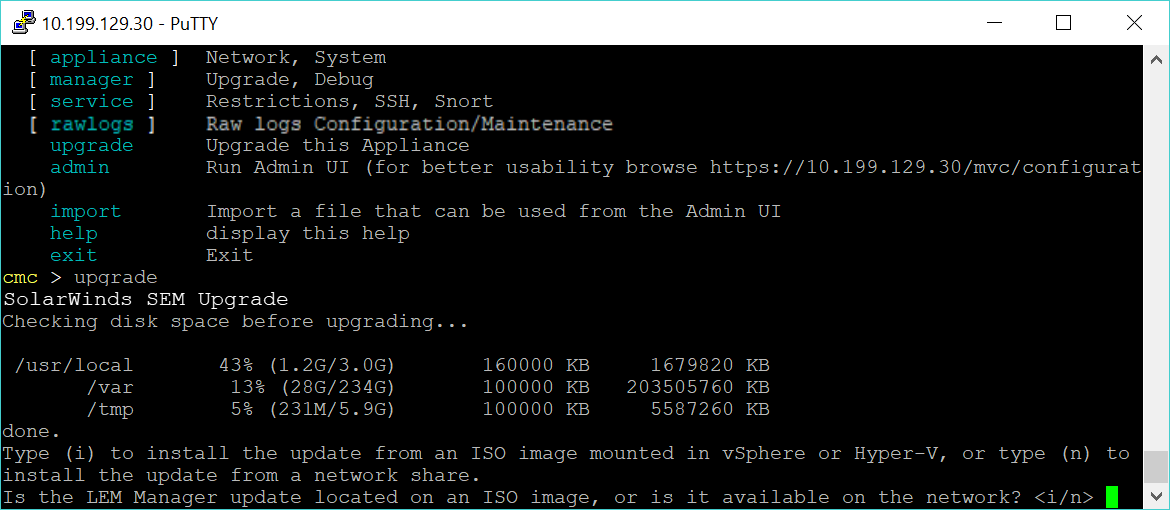 - Connect to the SEM virtual appliance using the vSphere or Hyper-V Manager virtual console or an SSH client (such as PuTTY).