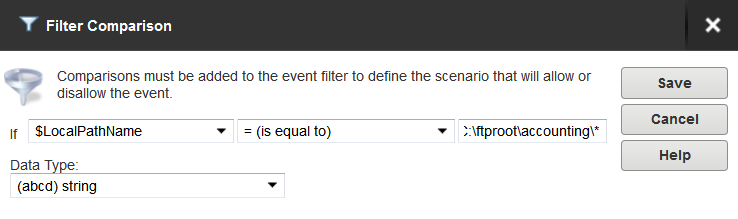 comparison If $LocalPathName = (is equal to) C:\ftproot\accounting\* with the type of (abcd) string. This will cause the event to trigger only for files that are located within