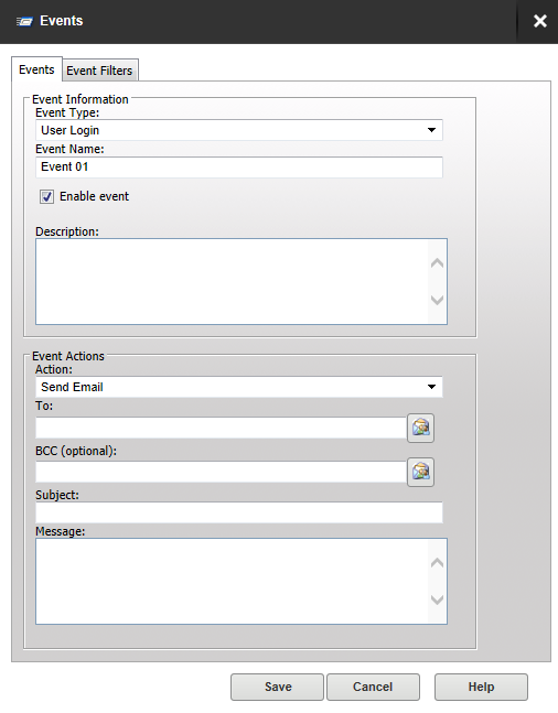 menu, and set it to Send Email. Enter the email recipients, subject line, and message content, and then open the Event Filters page. Create a new event filter, and add the filter