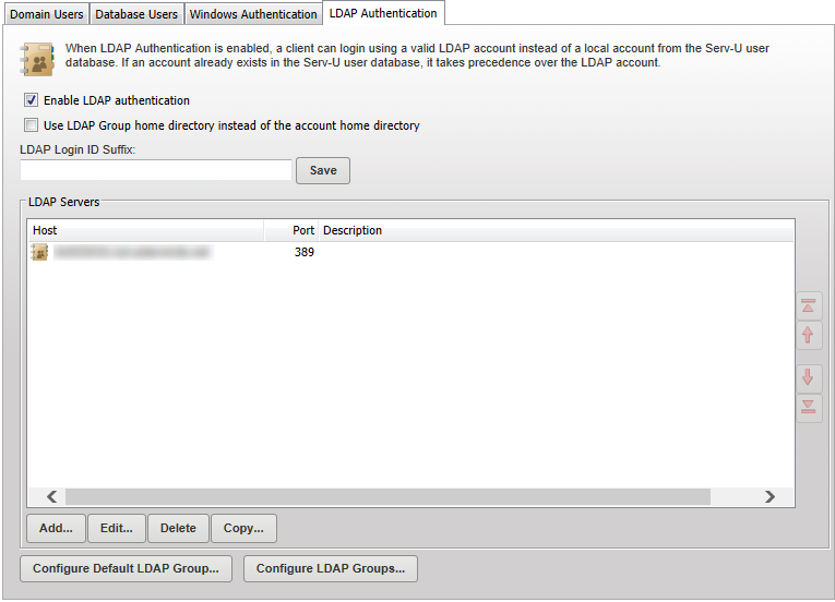 Serv-U requires administrators to define one or more LDAP Servers before LDAP authentication will work. LDAP Servers are configured on the Users > LDAP Authentication page in the Serv-U Management Console.