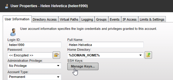 SSH key pair generation for users is provided by Serv-U for testing purposes only. Sharing private keys between more than one computer negates the security advantages of SSH Public Key Authentication. The SSH key pair should be generated on the client computer, and then the SSH public key should be sent to the server or server administrator.