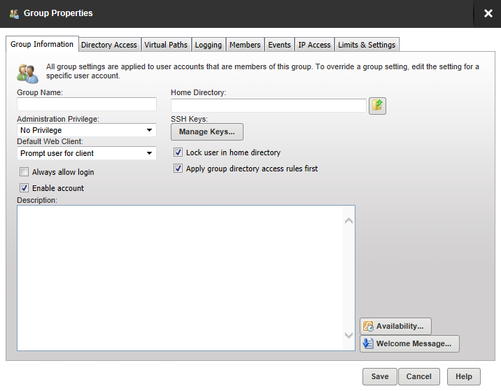 | Virtual Paths | Virtual paths are used to link a physical path that is outside the directory structure of the home directory of users in this group into the directory listings received by that user. |