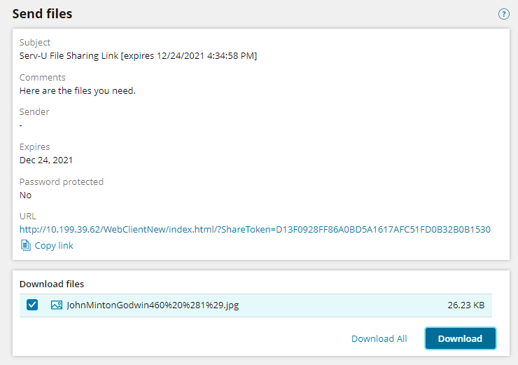The Send file wizard enables you to simplify the process of distributing files by creating a File Share. This lets you create a link which can be sent to one or multiple recipients which they can click on to download one or more specific files. The link can be emailed to the recipients automatically, and you can include sender details.