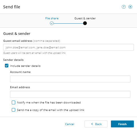 - To include the sender details with the file share, check the box and enter the sender's Account name and Email address.