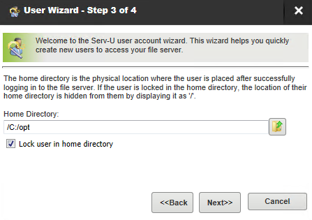 The home directory is the location on the hard drive of the server, or on an accessible network resource that the user account is placed in after a successful login. It is the location you want the user account to use when sending and receiving files on the server. Type the location or click Browse to select a location on the hard drive. If users are locked in their home directory, they cannot access files or folders above the directory structure of their home directory. Additionally, the actual location of their home directory is masked and displayed as "