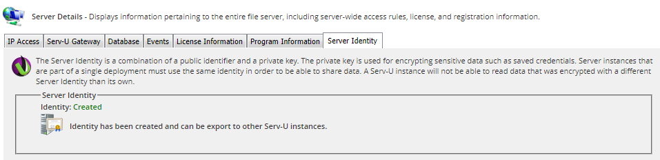 Once you have set up the Serv-U 15.3.2 or later File Server, you can export and save the Server Identity to use for further instances of this server - for example, if you are creating a multi-tier file server for load balancing or if you need to move the server to another machine.