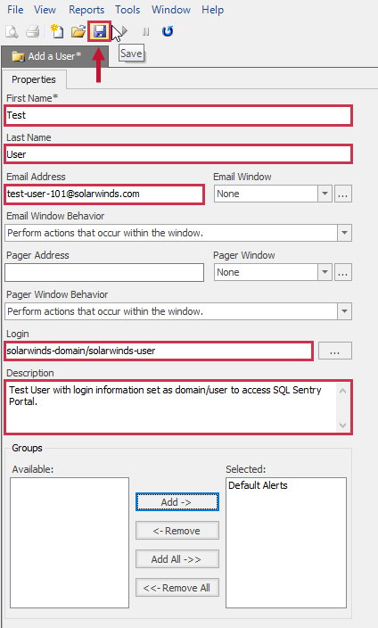 You need to create a contact in SQL Sentry and apply a domain/username in the Login field to use that user in SQL Sentry Portal. Create a user by completing the following steps: