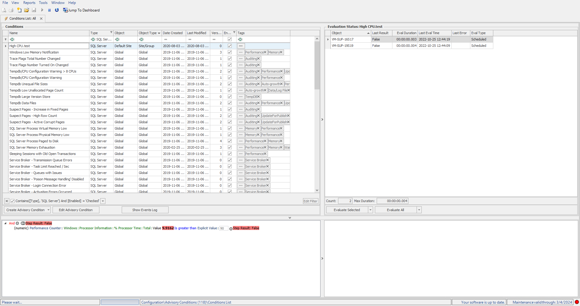 This condition is evaluated at the SQL Server instance level and has access to Windows and SQL Server performance metrics. Examples: See the 'Cost Threshold of Parallelism' Changed or High Avg Wait Time per User Session conditions in your installation or the Advisory Conditions Pack article. |
