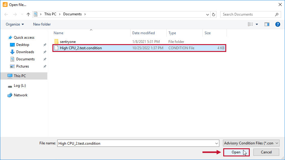 Navigate to the desired .condition file, and then select Open to import your Advisory Condition.