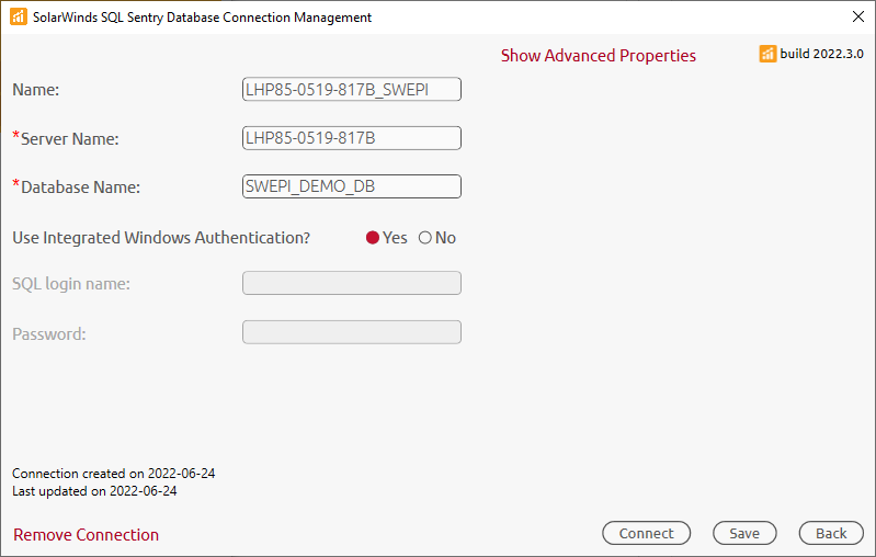 swepi package config ConnectionString --packageName sqlsentry --dataSource localhost --initialCatalog SWEPI_DEMO_DB --userID LHP85-0519-817B\JesseRemoteAgentUser --integratedAuth y -