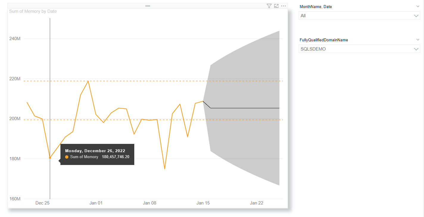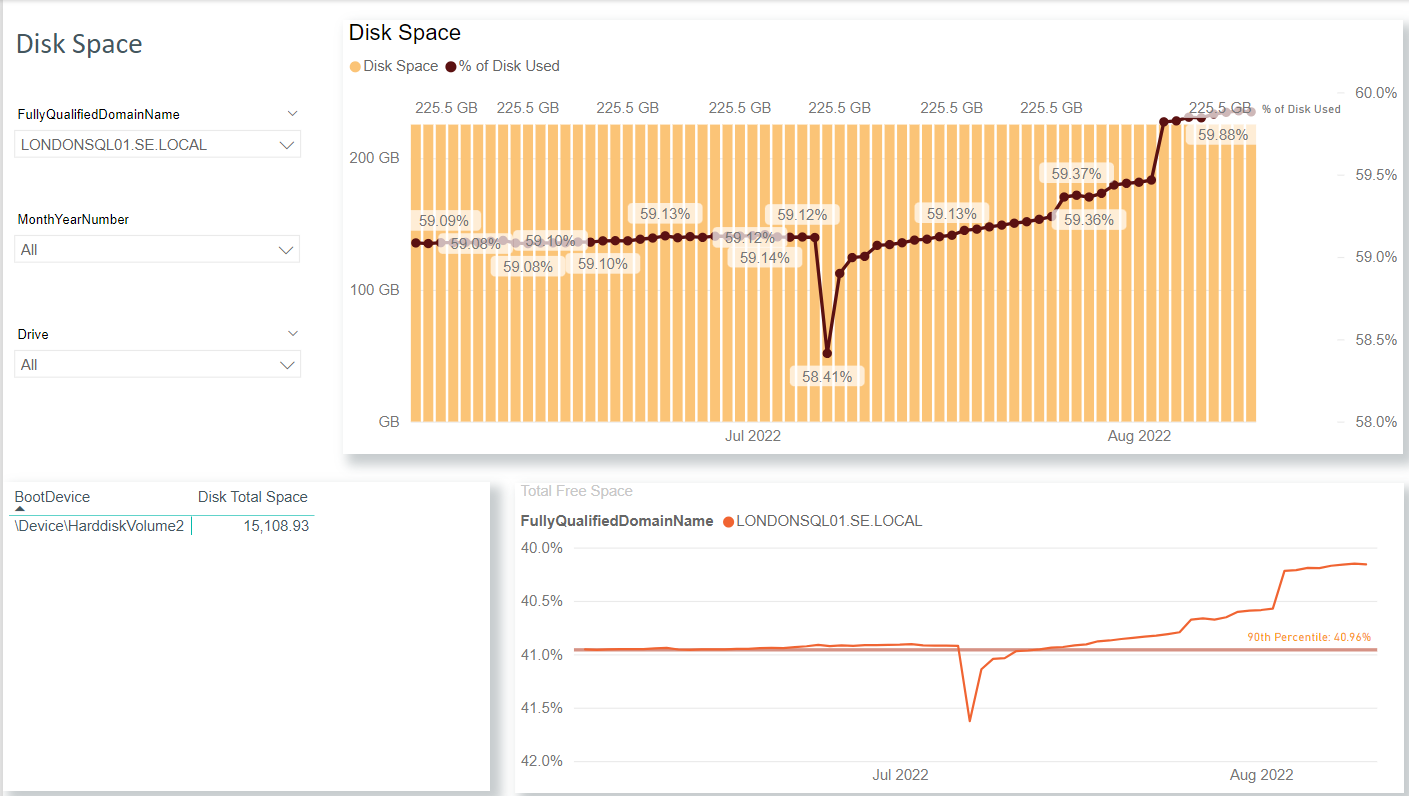 The Disk Space page provides a high-level overview of the available and consumed disk space percentage for your monitored server\instance(s). View the disk space for individual server/instance(s) by Month, and disk drive.