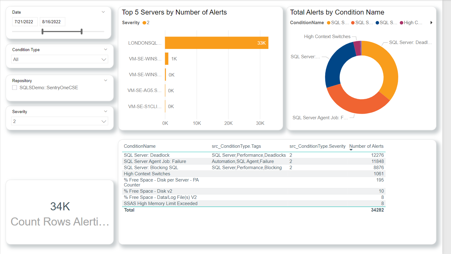 The Alerts page provides details about the alerts for your monitored server/instances(s) across the specified time period. View information about the Top Servers with alerts, the total alerts by condition, and the total number of count rows for alerting.