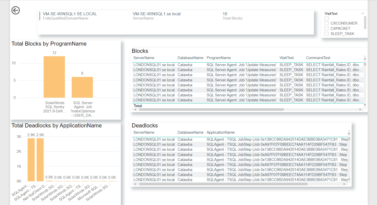 The Blocks/Deadlocks page Detail View provides details about the Total blocks by Program and Total deadlocks by application name for a specified server.