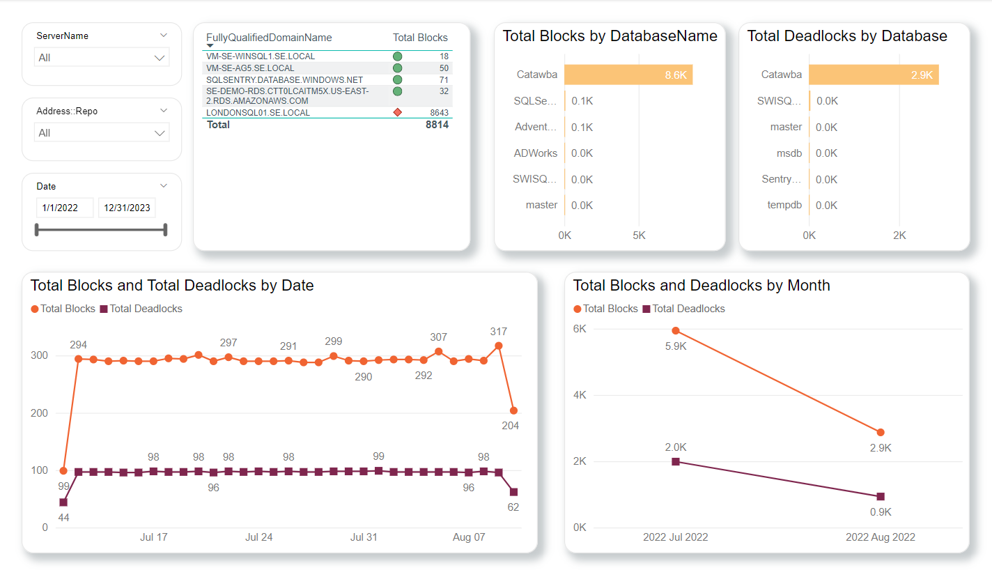 The Blocks/Deadlocks page provides details about the Total blocks and deadlocks by database, date and month for the selected time period. View more granular details by filtering for a desired Server or address.