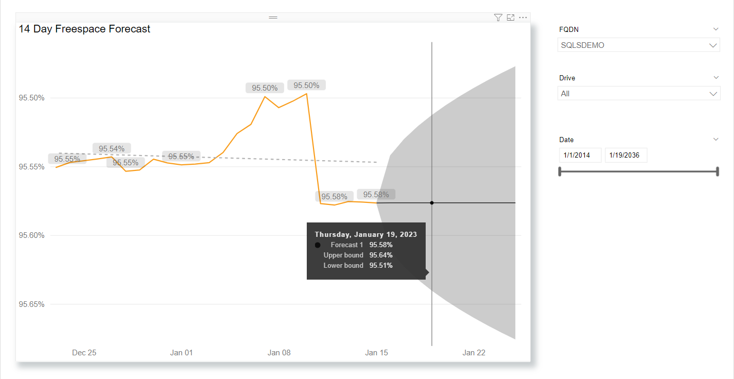 The Freespace Forecast page provides a 14 day free space forecast for your monitored server/instance. View forecasts for specific disk drives, and adjust the forecast based on the selected date range.