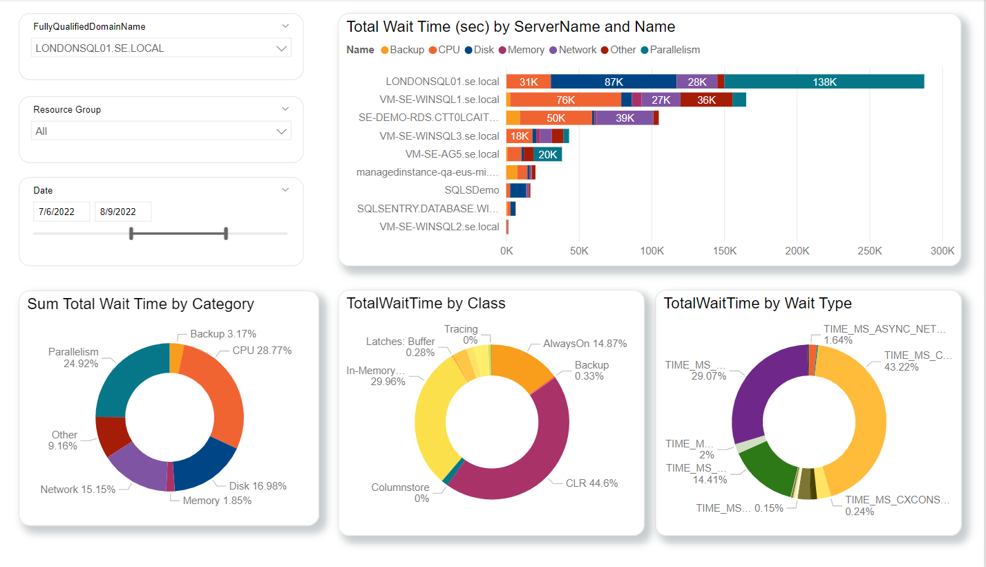 The Waits page provides details about the Total wait time by server and name, by category, by class, and by Wait Type. View more granular details by filtering for a desired Domain Name or Resource Group.