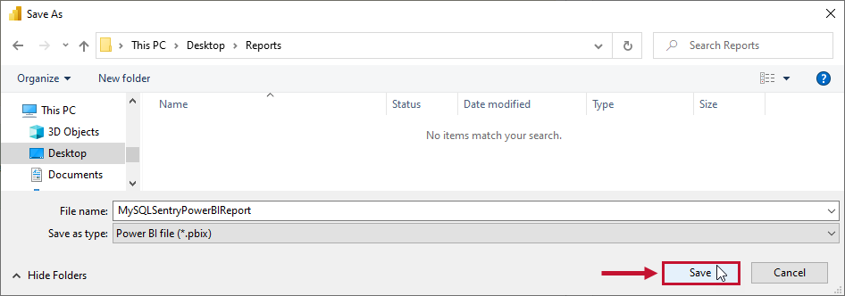 Select File > Save As to open the Save As window. Enter a filename for SQL Sentry PowerBI report, and then select Save to save your report.