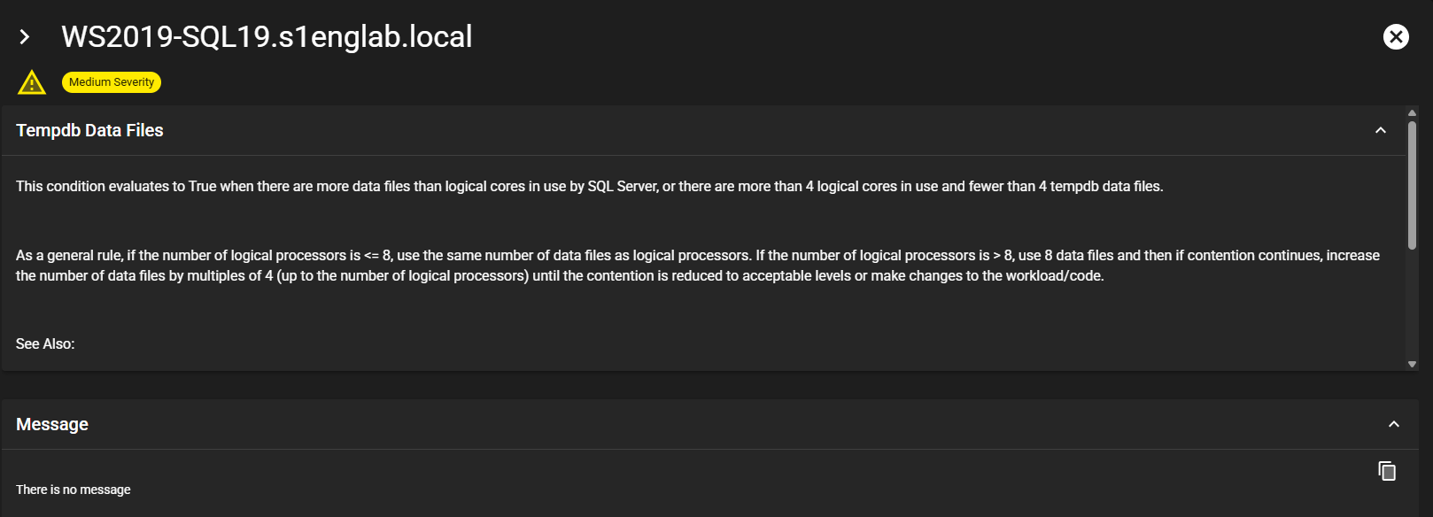 Alert Details displays a Severity at the top. Only alerts with a Category of Advisory Conditions have an associated severity level. The severity levels may be High, Medium, or Low.The available details vary depending on the condition, and may contain information such as the step of a failed SQL Server Agent job and the error behind the failure.