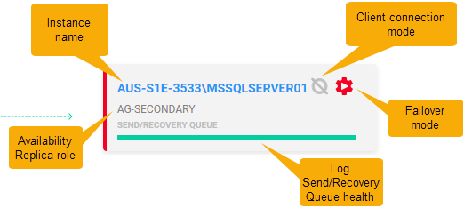Use the AG Topology graphs to view details about your SQL Server availability group replica(s). The AG Topology section displays the Primary replica on the left, as well as any secondary replicas within the Availability Group to the right. The following details about your replicas are available.
