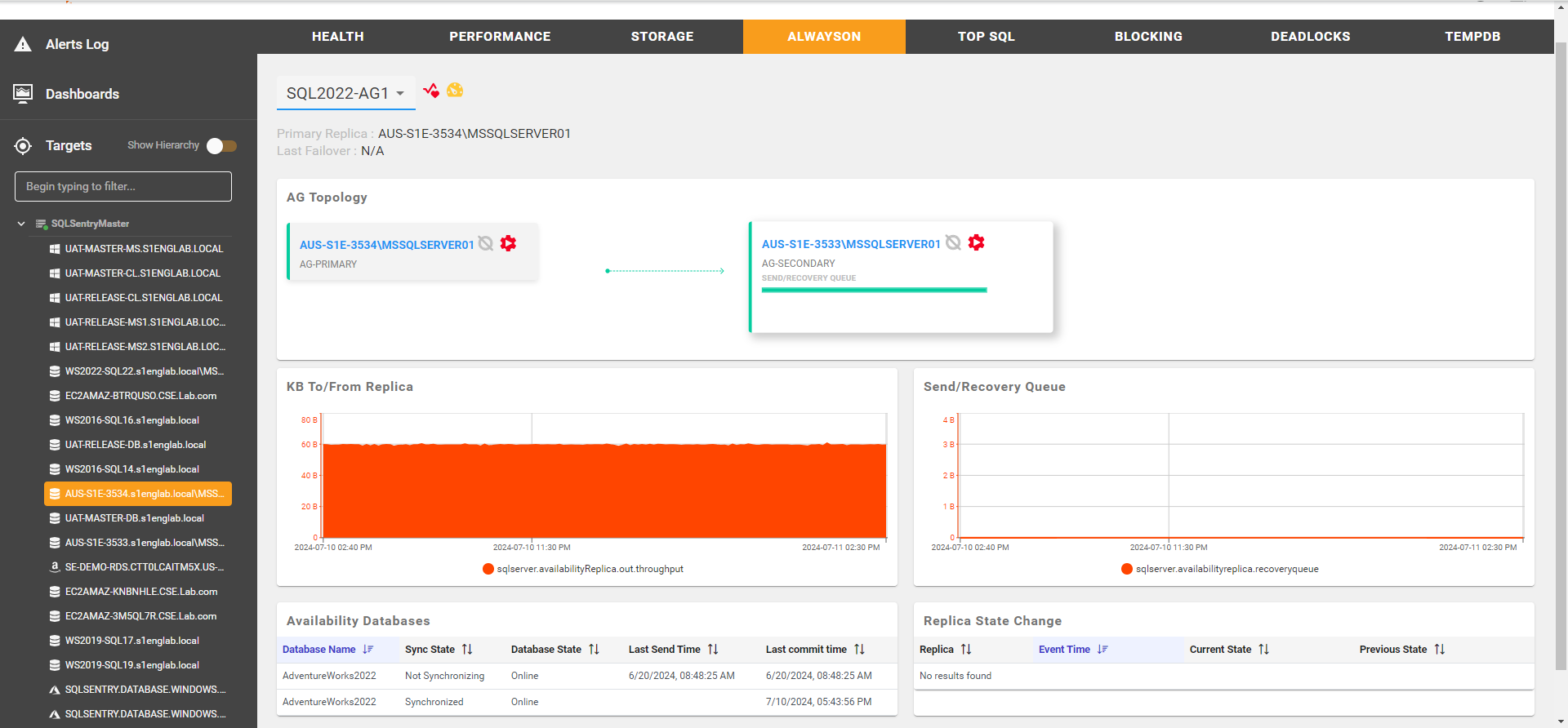 The Always On tab in SQL Sentry Portal is available for any monitored SQL Server instance hosting a Primary replica. View availability group topology information, data transfer graphs between primary and secondary replicas, availability databases, and any changes in the state of replicas for the selected cluster.
