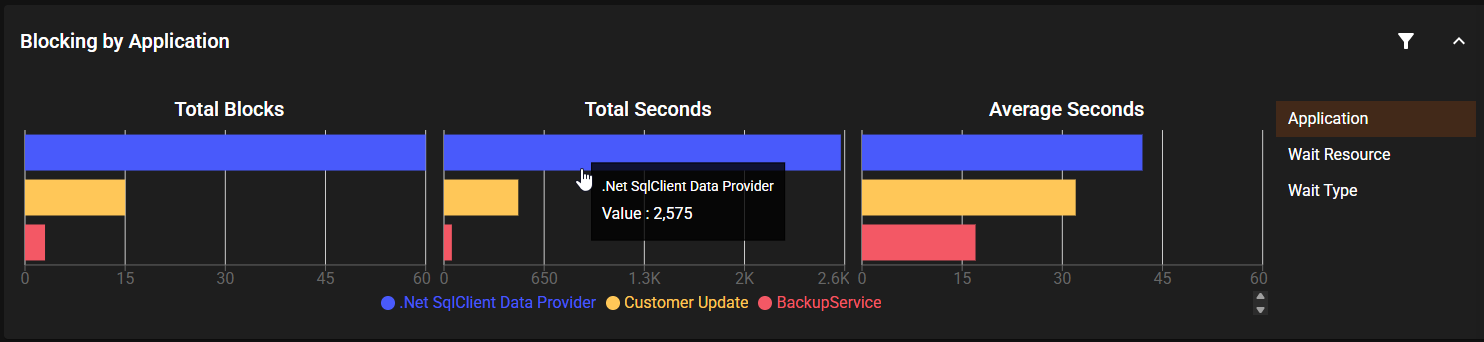 At the top of the screen is the Blocking by... chart, which allows you to select Application, Wait Resource, or Wait Type. Each chart displays the Total Blocks, Total Time (in seconds), and Average Time (in seconds).