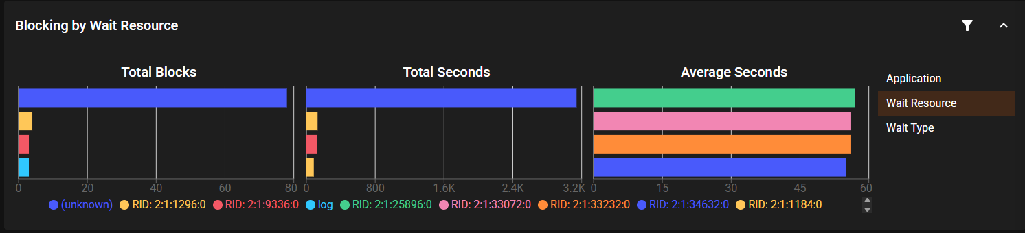 SQL Server can place locks on resources, at different levels, such as a table, page, or single row. The Blocking by Wait Resource chart shows you which resources are having the most serious blocks.