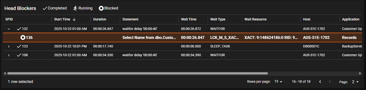 The top row is the head of the blocking chain and contains the blocking statement. There will be an icon at the beginning of the row to indicate if the session has completed (check mark) or is currently still running (running person).