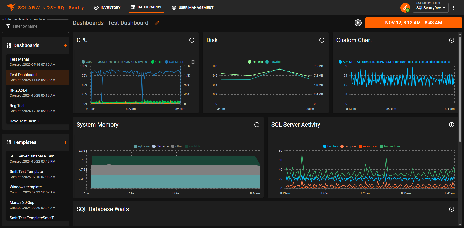 For example, you could create a custom template for the SQL Server database target type. You can add custom SQL Server Activity, Database I/O, SQL Server Memory, SQL Server Waits, Custom Charts, or any combination of available charts to your specifications. Then when you navigate to a SQL Server target, you can select your template from the Performance tab and populate your widgets for your SQL Server target. This way you can always have the most pertinent widgets for your target type monitored with SQL Sentry Portal.