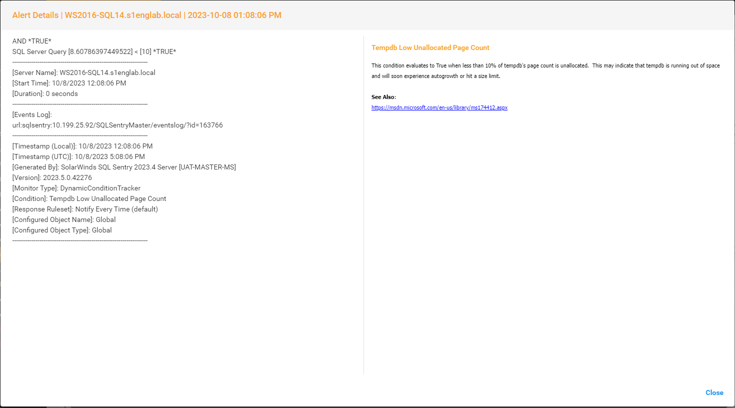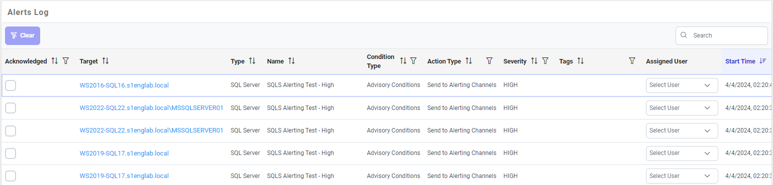 Jump to other views directly from the Alerts Log. Find the alert where you want to see more details. Select the target link and then select the tab you want to jump to (Health, Performance, Storage, Top SQL, Blocking, Deadlocks, or TempDB) to open that tab for your target.