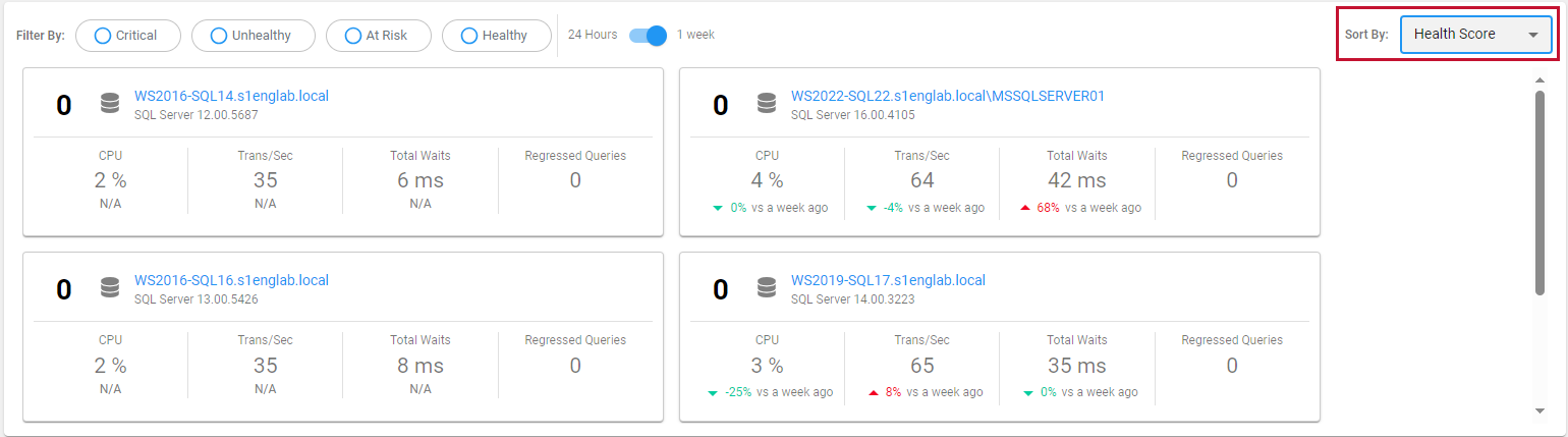 Use the Sort By drop-down menu to display the difference between the current score and the last recorded average score for each of the monitored targets in your environment. The Sort By drop-down menu lets you specifically filter by category: Health Score, CPU, Transactions/Sec, Total Waits, or Regressed Queries. Select the desired category to display the results for all of the monitored targets in your environment.