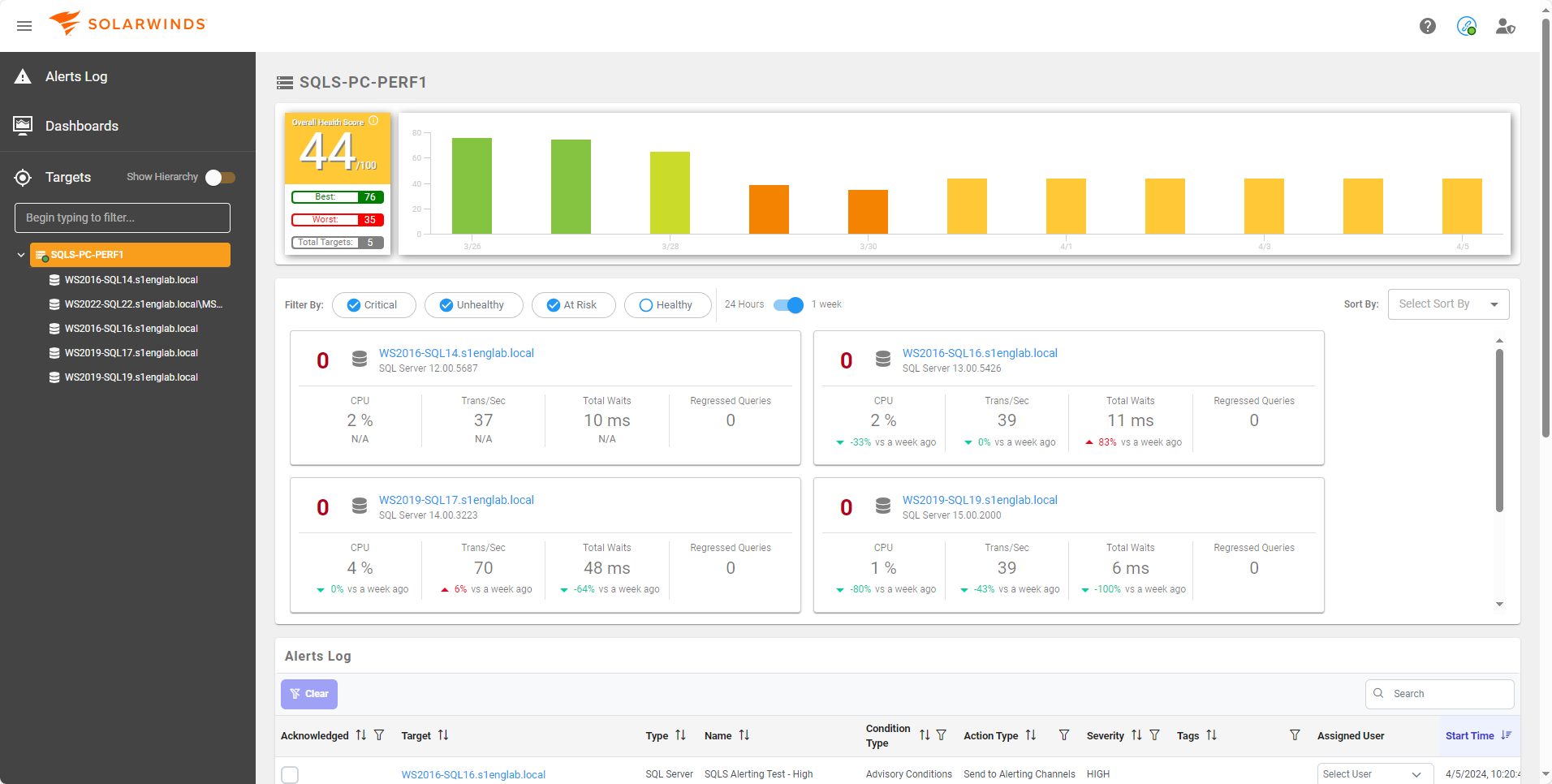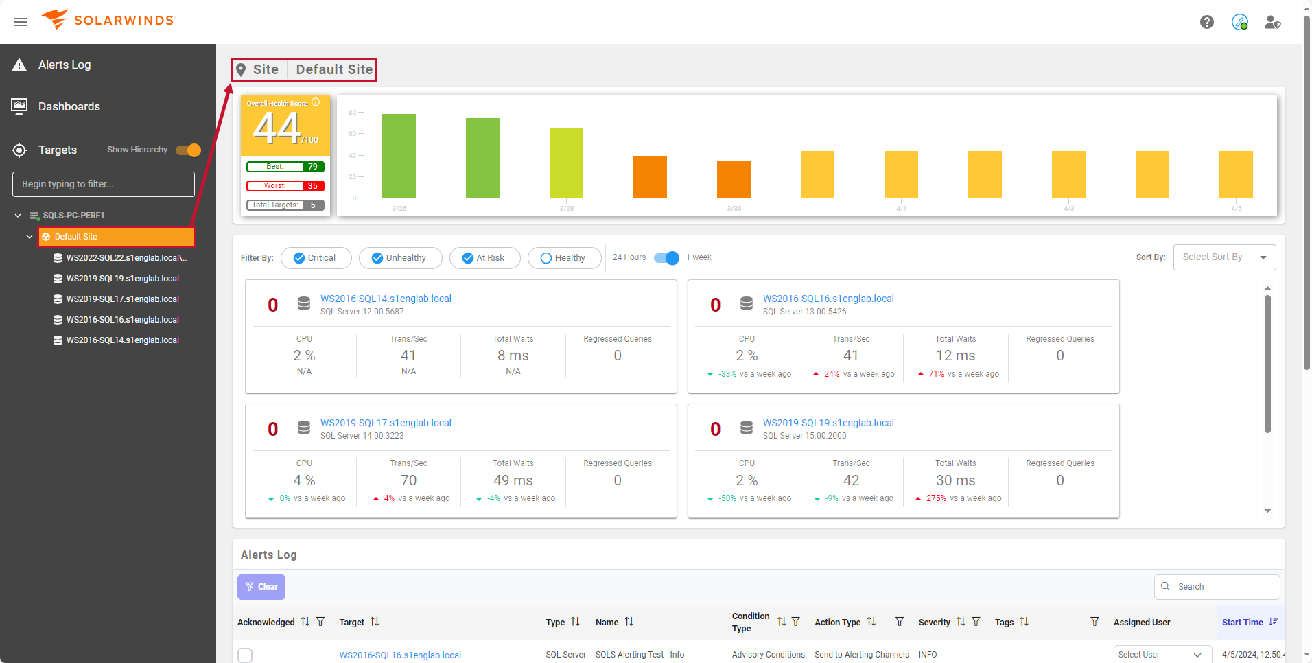Quickly filter between health statuses with the Environment Score sheet. The Environment Score sheet displays Critical , Unhealthy , and At Risk scores across the monitored targets in your environment by default across the last 1 week period. Any checked status will be included within the filter. For example, if you check Healthy, then Healthy scores will be included with the Critical, Unhealthy, and At Risk default scores. Uncheck any scores that you want to remove from the display. Scores are sorted in descending order with lower scores within a selected health status category displayed before higher scores within that category. Any time you select a health score status, the Alerts Log will refresh with alerts corresponding to your selection.