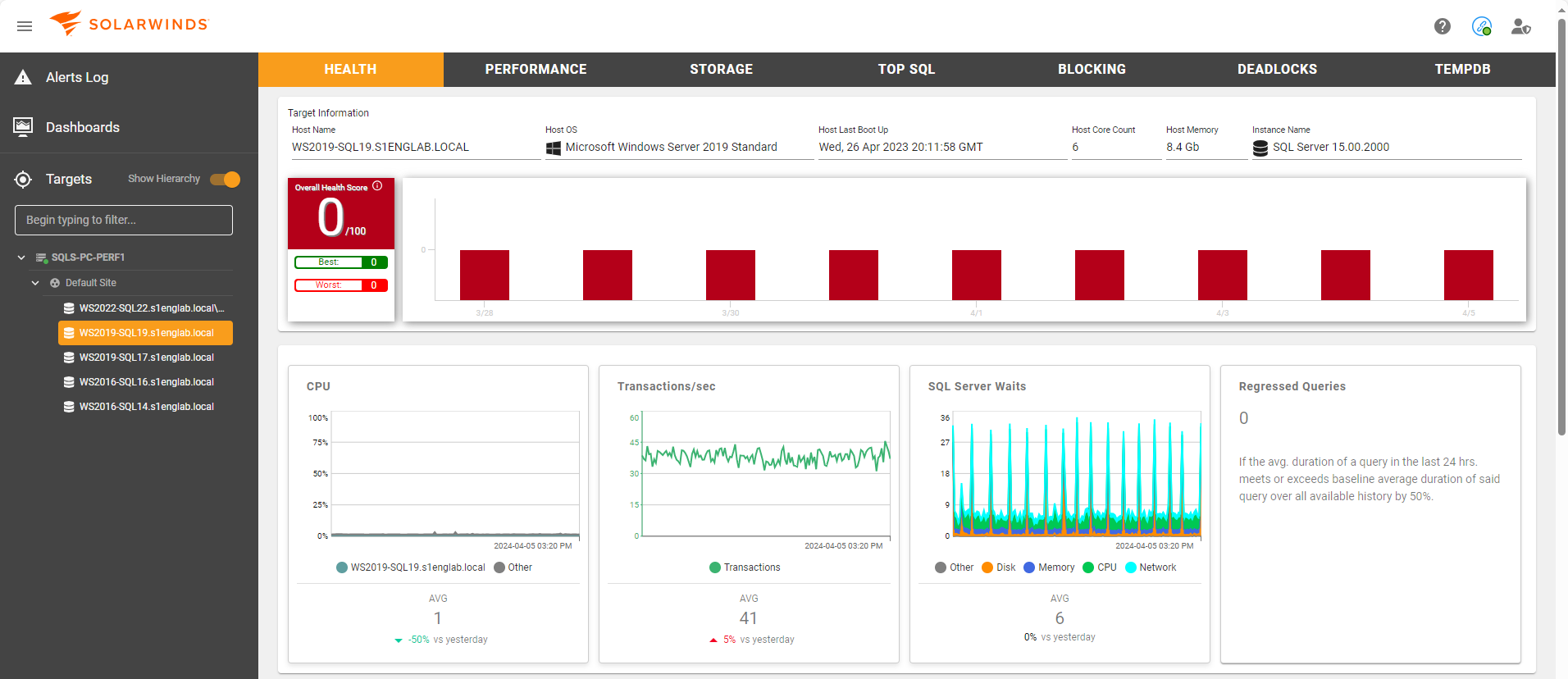 When you select a Target view in SQL Sentry Portal, the Health tab displays by default. The Health tab displays the overall health about your selected target. At the top of the page are details specific to your target, including Host name, Host operating system, Host Last Boot Up, Host Core Count, Host Memory, and Instance Name. With Version 2023.4, view target vital statistics such as CPU, Transactions/Second, SQL Server Waits, and Regressed Queries across the current 24 hour period.