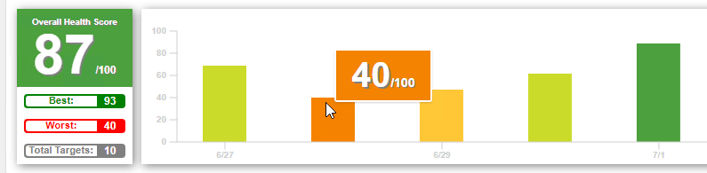 Health scores are color coded, making them easy to identify and compare in the chart. Hover over a bar in the chart to display a tooltip of the score for that day.