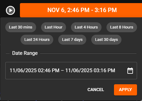 Use the date selector to select an available Range or define a Custom Range of time for data to view on the dashboard. Use the Days, Weeks, and Months options to select an entire day, week, or month range at once.